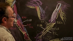 Artists learn how muscles attach via aponeuroses, how they interdigitate, and how fiber directions create visible surface forms. Rey shows landmarks on live models and uses memorable teaching tools like the "picket fence" analogy. These methods make complex anatomical relationships easier to understand and apply during figure drawing sessions.
