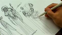In this lesson, Sang starts rough sketches, looking to solve questions about the character's gesture and expression before committing to final details. He emphasizes that investing time into the foundational pose pays off when it comes to the full character during following rendering stages. He notes that strong gesture isn't just about dynamic posing, it's a primary tool for communicating character personality, emotion or intent.