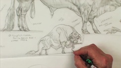 In this first title of a series, Terryl demonstrates how to create a fantastic yet utterly believable creature based on one of the most commonly known animals, the domestic cow. After drawing a study of an actual bull, she shows the process of designing a realistic "Moo Monster". Starting with rough thumbnails and ending with a fully rendered action-packed color illustration, she shares her techniques and tools – pencils, markers and tracing paper – as well as a thorough exploration of animal anatomy. During the course of the demo, Terryl shows how she indicates forms and planes, how she chooses and applies color, and how the underlying skeleton and muscular systems affect the surface anatomy. Above all, she emphasizes the "Why" of the creature – how its lifestyle and environment affect its design and appearance. She also instructs how to create a humorous character derived from the more realistic versions for a truly versatile, professional portfolio.