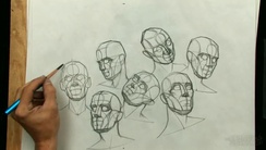 This lesson teaches fundamental head construction through a process-oriented approach that prioritizes learning over perfection. Ron distinguishes between construction and refinement marks, emphasizing that warm-up exercises should focus on creating functional results. Artists learn to work with abstraction rhythms and leave mistakes visible to develop a deeper understanding of facial structure.