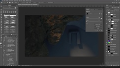In this lesson, Wojtek explains camera projection as a powerful technique for efficiently creating hand-painted textures and masks that integrate with a shader network. By painting masks in Photoshop to drive color corrections and effects in Houdini, intensity and blending can be adjusted while introducing natural detail that is difficult to achieve through purely procedural texturing. This approach is particularly effective for hero assets such as cliffs, where photographed rock detail, wet streaks, and directional staining help create believable, artistically controlled surfaces.